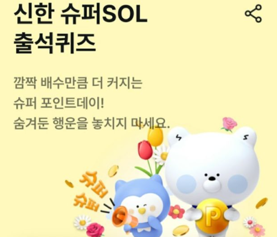 신한 슈퍼 SOL 앱 ▶ 혜택 ▶ 포인트 더 모으기 ▶ 출석 퀴즈