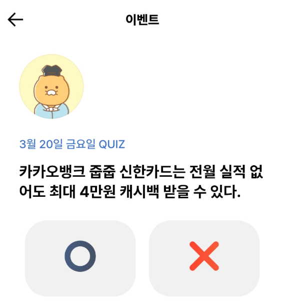 문제: 카카오뱅크 줍줍 신한카드는 전월 실적 없 어도 최대 4만원 캐시백 받을 수 있다. (O, X) 퀴즈