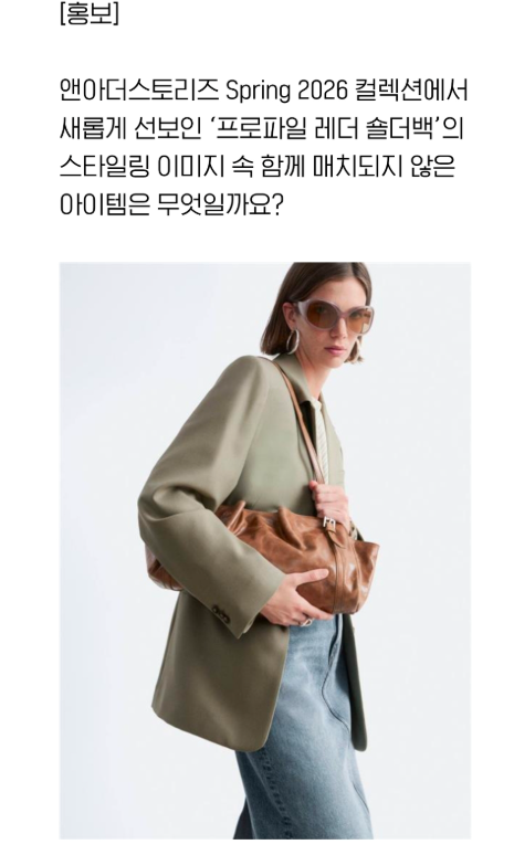 [홍보] 앤아더스토리즈 Spring 2026 컬렉션에서새롭게 선보인 ‘프로파일 레더 숄더백’의스타일링 이미지 속 함께 매치되지 않은아이템은 무엇일까요? [출처] 3월 20일 h포인트 H.Point 옥션 퀴즈 정답|작성자 오공이